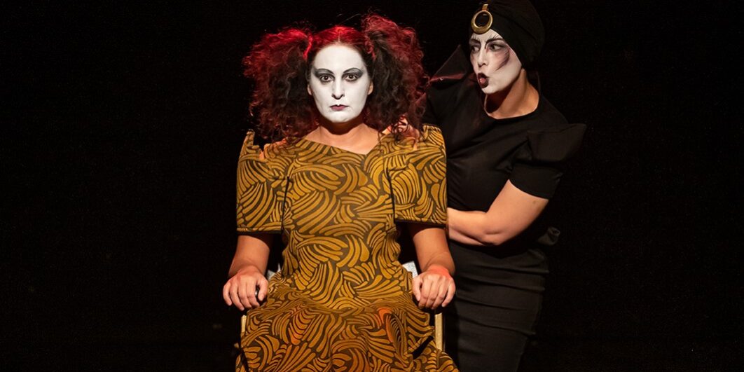 As much as the scenography was clear in its intentions, the choice of wardrobe was kept neutral, with both the living and the dead having their faces painted white with dark black shadows – which, once again, could simply be justified by the fact that this story is timeless and the character of Alice lives in a fantasy world, where all her experiences and knowledge might be discombobulated.