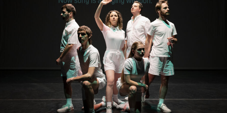 Tamás Jászay: Here we also have to talk about the childhood memories that are evoked when six people in uniform perform various gymnastic feats under the instructions of an invisible power. It is rare in Hungarian theatre that text, music, movement, video and the use of spatial forms are so closely linked, and with such a serious ideological, political and cultural context.