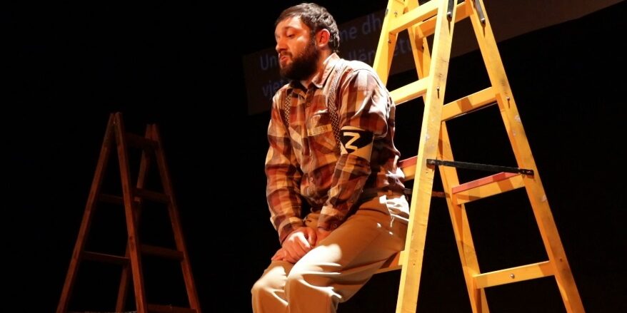 Galushi first appears on a darkened stage with a suitcase in his hand, equipped only with a small wooden bench. In a kind of prologue, a visibly broken character enters the stage and states the reasons for the persecution of Roma at that time. These are the same prejudices that today still lead to discrimination and exclusion of Roma: “The reason they detained us here was that the word was spread all over the country that we are lazy, criminals and spies. In order to re-educate us, they decided to take us to the camp with ‘Arbeit macht frei’ written at its entrance”.
