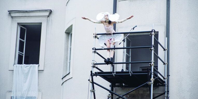 While Angels in America – subtitled A Gay Fantasia on National Themes – is still relevant and witty, it could still feel passive or start to drag after a while, but this was more or less avoided by changing locations throughout performance. We start in front of the theatre, then we go to the Lower Hall and alternated from there to a yard between the Mladinsko Theatre and the student accommodation at Akademski kolegij. This last move might be problematic from the point of view of the students living there, as the parts of the show, which are performed outside, are extremely loud. The building is used as a stage to some extent and given that the loudness is uncomfortable for the audience, I can only imagine how the students feel about it being exercised so often in front of their windows.