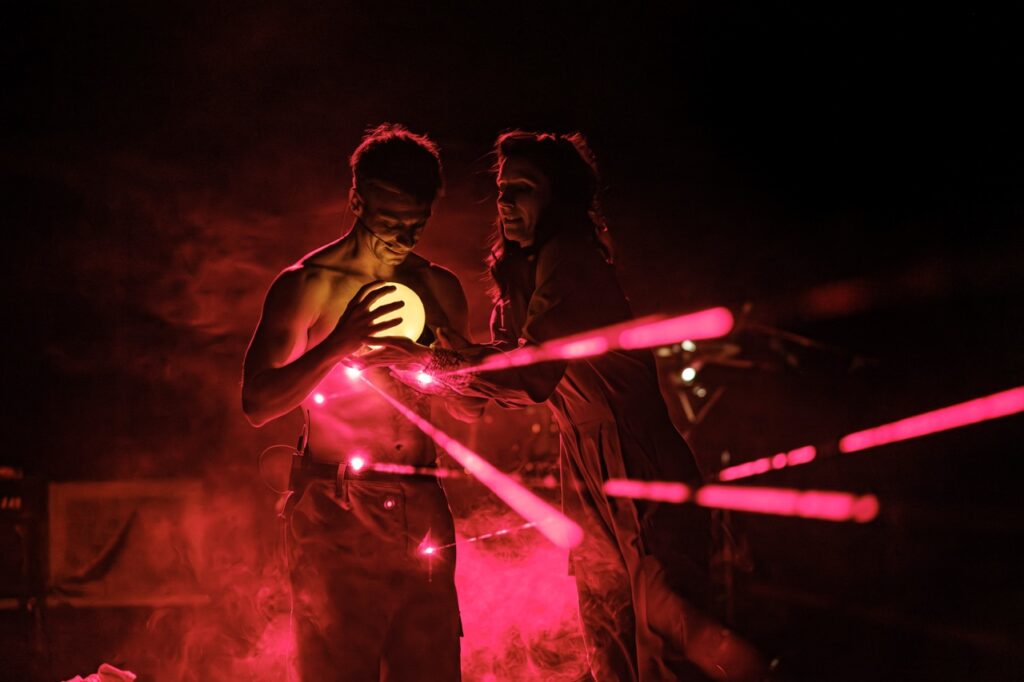 The cast is about fifteen people strong, not counting the live band seated at the back of the stage. Although the sheer number of performers might suggest Blank to be an ensemble piece, it ultimately revolves around one person only. One of the actors portraying Štukan is Davor Golubović, whose energy is at a maximum, forcing the audience to engage with him and sustaining an electric tension throughout the scene. Praise also belongs to several cast members whose utterly comedic performances bring lightness and laughter to the audience. Anja Kraljević, as the beauty pageant contestant and girlfriend, proves to be wonderfully self-ironic, delivering lines of accidental wisdom such as “Be the best version of yourself” or “Build bridges, not wars.” Elma Juković, as the Berlin girlfriend Betty, both sings and raps in flawless German, turning her scenes into brief yet memorable bursts of musical theatre.