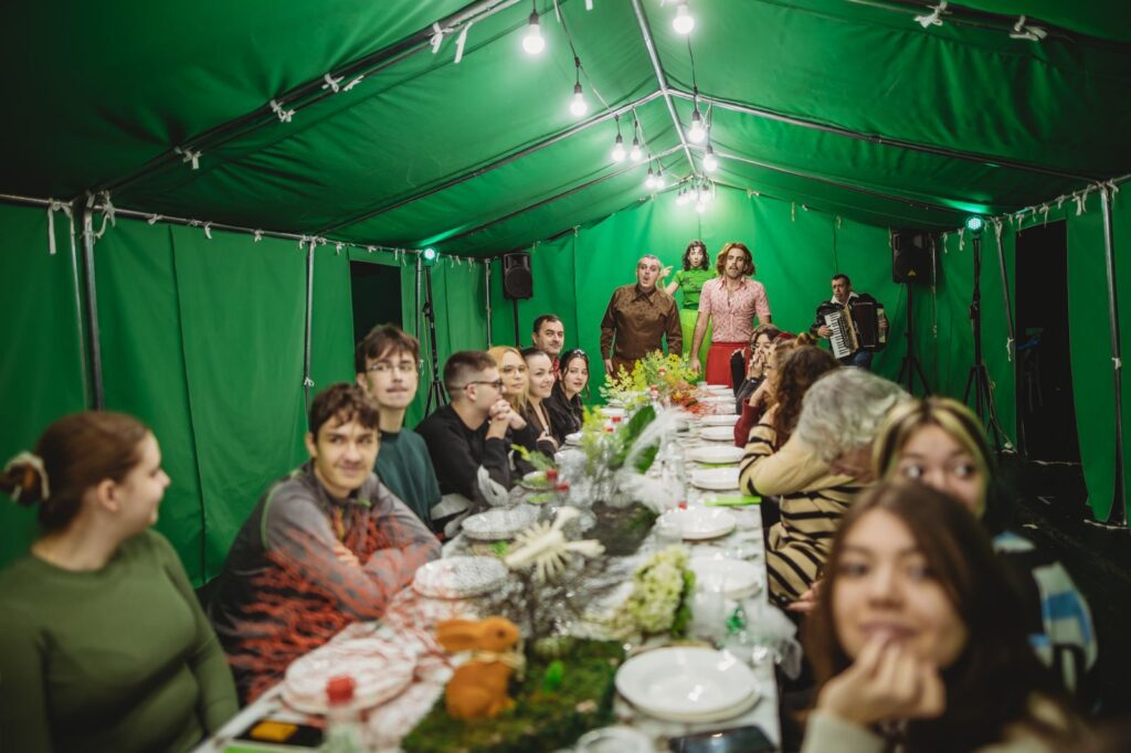 Kokanov’s adaptation keeps the characters and their stories, but puts them in a new frama – their weddings – where all of their fates and their relationships can be seen in a single event. In Serbia, there are often two weddings taking place in one wedding venue, so the decision to make a show about two weddings taking place at the same time comes even more naturally. The audience at the beginning gets invitations to the wedding they’re going to attend and is divided and led to different parts of the theatre. On Brigitte’s wedding invitation, the focus is completely on Heinz and his family, while Brigitte’s name is written in smaller letters, so the relationships in this family are clear from the start. The female audience members are invited to have a drink at the wedding table, where they sit watching each other and the actors among them. The wedding is a stage, the ceremony is a show, and we are here to be impressed.