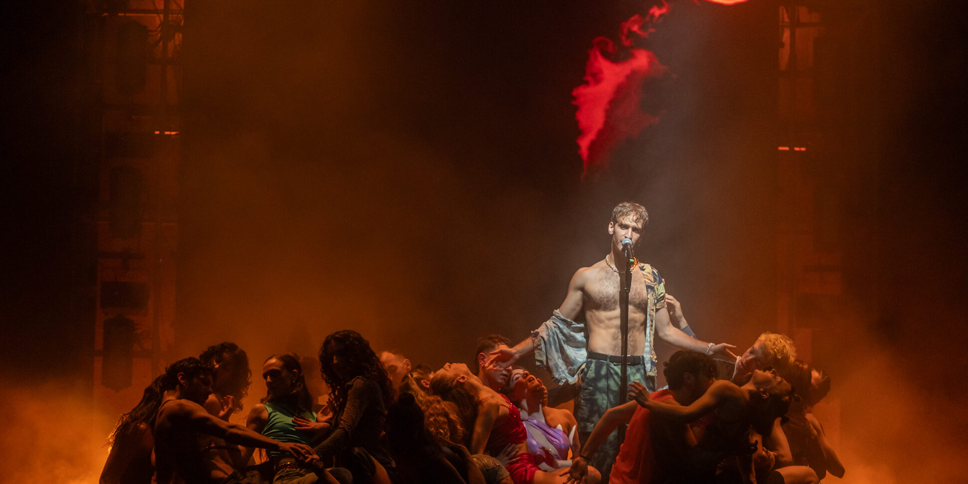 On stage are 25 young performers – including the DJs Reign of Time, 11 actors and 12 dancers – who are already dancing. They keep on moving constantly, as if they will drop unconscious if they don’t carry on moving. Like the oxygen machine, it feels like their – and ours – heartbeat will stop if they stop moving. As long as the doors are open and people are entering, we are ‘’allowed’’ to take pictures and videos of what’s happening on stage. But, as soon as the doors are closed and the stalls’ lights are dimmed, the usual announcement goes off, in a distorted voice, that we are no longer ‘’allowed’’ to take pictures or videos of the performance. We are now part of their rave, part of their universe.
