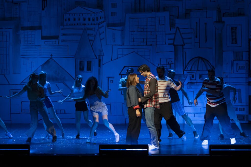 The war marks a profound historical rupture and a pivotal peripeteia in the dramaturgy, making the production feel almost like two separate pieces, or: like day and night — before and after intermission. This division is reinforced visually, too: costumes (Vanja Ciraj) and lighting trace the passage of time, with a yellowish dreamy palette marking the 1970s and 1980s, gradually giving way to colder, darker tones. By the second half, black and blue dominate, symbolizing mourning and the weight of loss. The backdrop remains constant, however, with Sarajevo’s skyline rendered in stark black and white, resembling a handwritten musical score. The cityscape, beautifully designed by Osman Arslanagić, is enriched by the minarets of elegant mosques, the bell towers of the Sacred Heart Cathedral, and the geometric lines of socialistic skyscrapers, creating a layered and evocative portrait of the city.