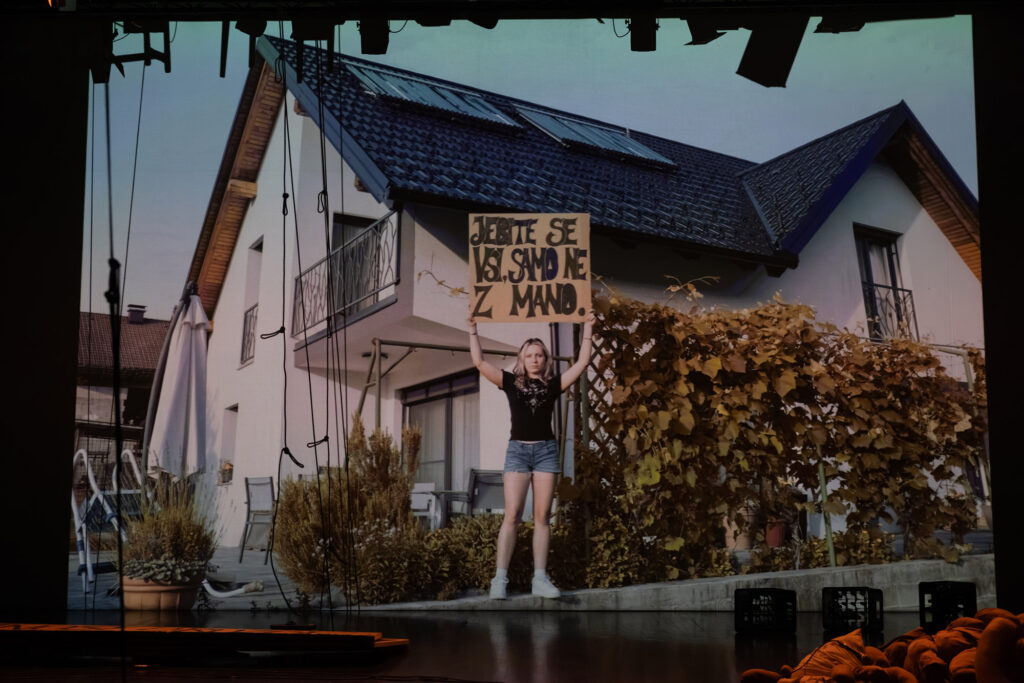 A journey through the meanders of feminisms, Slovenian villages, and violence is now being undertaken by Barbara Kukovec, along with her story about leaving and returning to the countryside. In this part, the rural collides with the urban. She criticizes Ljubljana for hosting a feminist exhibition in 2023, pointing out Slovenia’s delayed response to feminism compared to the West. This also raises the question of Slovenia’s cultural place in the world and its peripheral status. One of the most valuable parts of the performance, however, is the film segment, in which we can admire Barbara’s return to the countryside, where she wanted to present performances to women from various communities. Performances took place in nontraditional spaces, but safe spaces, such as a village women’s club room or her cousin’s living room. The screening also includes a series of photographs taken in rural areas. They depict women standing in front of their homes, holding banners with various feminist messages. This gesture gives these women a genuine voice, rather than merely being a voice about them.