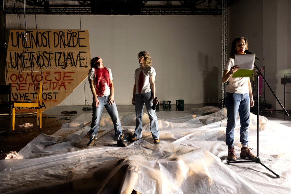 In that pile, the performers find a knife, which reappears later when they describe the murder of the woman from the village, serving as a symbolic link between the rural part of the play and the part about violence. There are several such parts. The performance does not focus on a single topic, rather addresses a range of issues that feminism deals with; from consensual sex and micro sexual violence to the femicide. The actresses take on the roles of the Bukovec sisters. In a space designed by Meta Grgurevič and Olja Grubić, three performers, together with the musicians from Dead Tongues, begin a story that starts lightly but ends on a heavy note. The Bukovec sisters wearing shorts and boots act as a kind of narrator, an ancient Greek chorus (but a female one) who use songs to comment ironically on reality. The protagonists don’t have clearly defined personalities, rather, they narrate themselves.