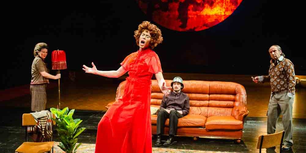 The stage design by Ana Savić Gecan is of a typical upper-middle class apartment with very 1950s style decor, with a lot of patterns and different shades of brown. The costumes too, also done by Savić Gecan, are filled with various patterns, most notably tartan and houndstooth which adds to the vintage aesthetic and evokes the time period in which the text is written. At times, a rustle from the radio can be heard, a sound which will later only add to the absurd atmosphere and the glitching of the actors’ speech and movements. These glitches and bugs become more frequent as the play moves ahead, giving the impression the characters are a part of a simulation which keeps lagging and going wrong. The idea, or rather a conspiracy theory, that we are living in a simulation, that people’s lives are programmed by a Master Computer run by something or someone is quite a popular motive in popular culture and fiction. Think Netflix’s (unfortunately) cancelled series 1899 or Herve Le Tellier’s novel The Anomaly. Sure, one can argue that theatre plays can be considered a form of simulation, even those that are seemingly based in improvisation. It’s pointless to try and differentiate what is expected and what isn’t in a performance – we might be manipulated in both cases. But, personally, this simulation aspect of the play intrigues me the most.