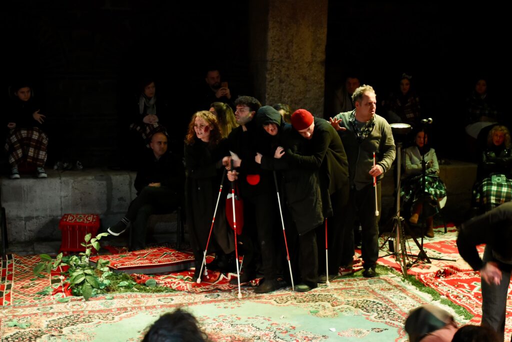 Rijani uses the space not merely as a background but as part of the play’s language. The Blind opens with a quiet reading from Maalouf’s In the Name of Identity, a moment that invites contemplation. Then, suddenly, the actors appear on the walls of Kurshumli An, caught in a confrontation that breaks the stillness. As they descend among the audience, abstraction turns into action — the theme of identity becomes immediate, embodied. What follows feels almost like a confession: the ensemble addresses the audience directly, speaking about their own reality as part of the National Turkish Theatre. This brief yet powerful sequence grounds the performance in the present, linking the metaphorical blindness of Maeterlinck’s text with the tangible challenges of a theatre — and a community — still searching for its place.
