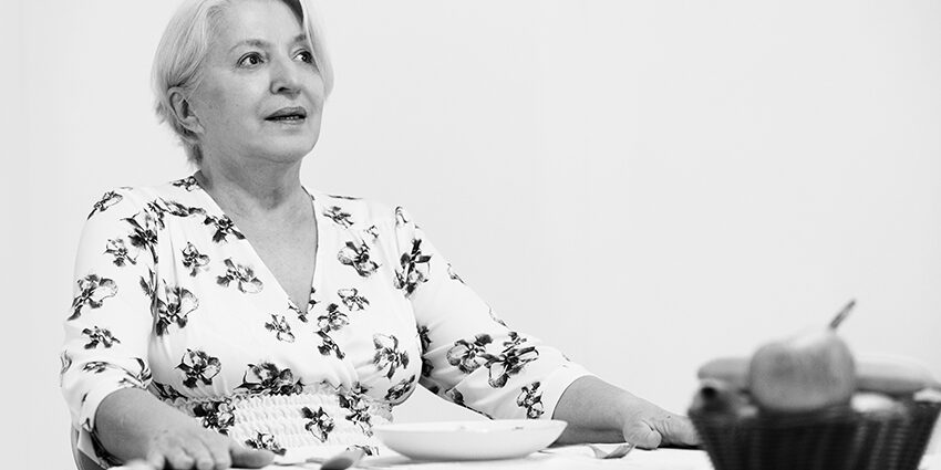 But then something off-key, mysterious, maybe even fantastical happens. After Azem retreats to other parts of the apartment, Sadika arranges the dining table for her birthday lunch and celebration and starts talking to her family members – children, grandchildren, in-laws – who are not there. The audience doesn’t see the new characters on stage but we do hear them through our headphones, together with the realistically-crafted dialogue between them and Sadika. The usual family-gathering conversation plays on – is everyone coming?; who is sick and should I be worried about them?; don’t hide your problems from me, I am old but I deserve to know everything and want to help you. The dishes and cutlery are clanking but only through our headphones and, apparently, in Sadika’s mind.