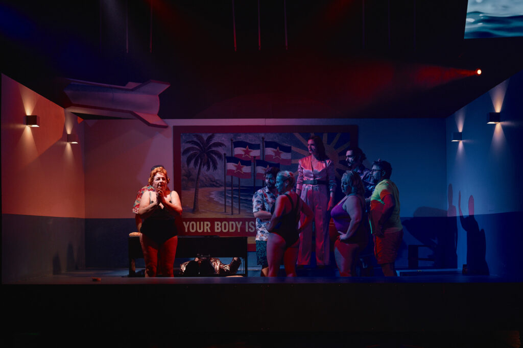 That single scene, three sisters in swimsuits celebrating a name day, Yugoslav flags behind them symbolising a country that fell apart in war, as they talk about a war that had happened, while several wars rage across word today, and behind them the reminder that the female body is a battleground, illustrates how every fragment of this production can be unravelled and interpreted. Many such moments flash by too quickly, or slip past us unnoticed, simply because of the piece’s density and the sheer amount of action to follow.